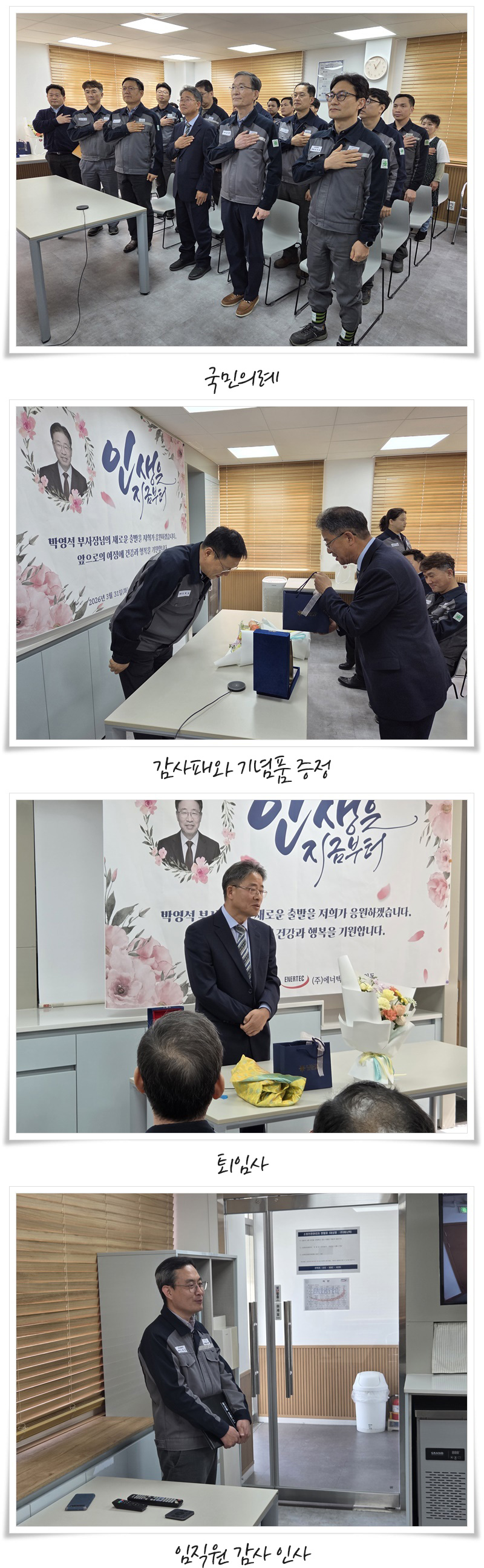 ㈜에너텍은 지난 2026년 3월 31일, 박영석 부사장님의 퇴임식을 실시하였습니다. 이번 퇴임식은 사장님의 감사 인사 말씀과 함께 부사장님의 퇴임사, 마지막으로 부사장님께서 걸어오신 (주)에너텍의 발자취를 되돌아보는 기념 영상 등의 순으로 진행되었습니다.