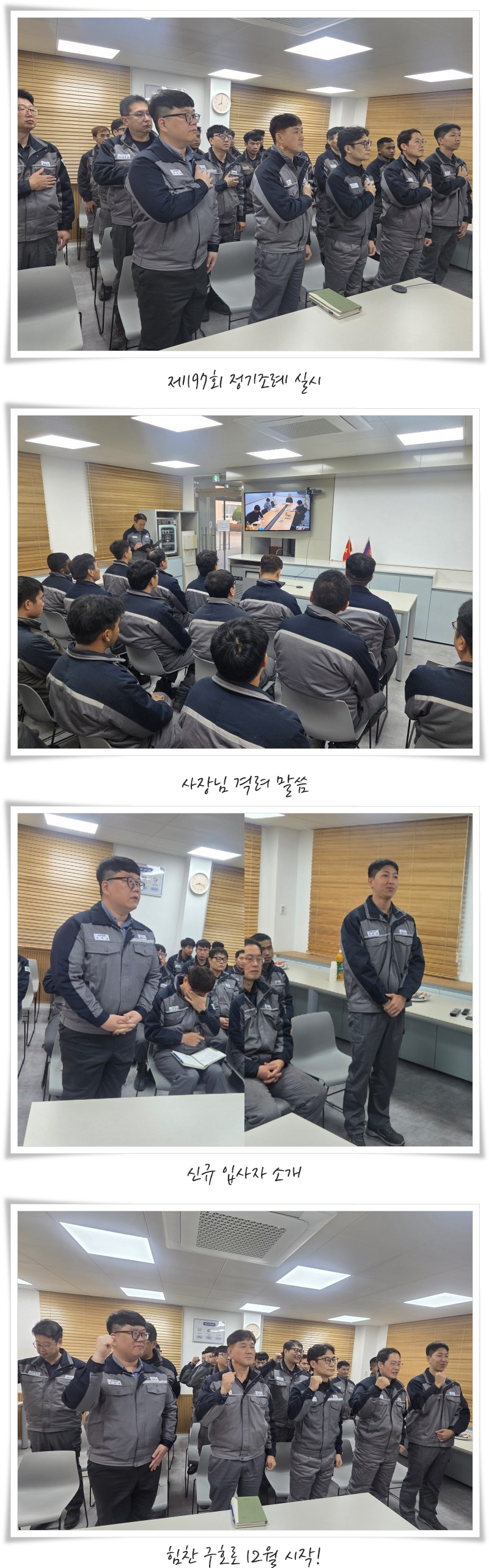 사장님께서는 올 한 해 동안 수고해 준 모든 임직원에게 감사와 격려의 말씀을 전하시며, 남은 12월도 유종의 미를 거둘 수 있도록 잘 마무리하자고 당부하셨습니다. 아울러 그동안 아쉽거나 부족했던 부분을 돌아보고 점검하여 내년을 더욱 철저히 대비하자고 강조하셨습니다.