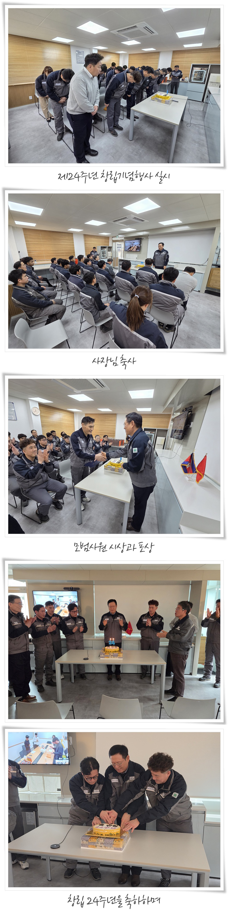 사장님께서는 기념 축사에서 회사 설립이후 어려운 여건 속에서도 맡은 자리에서 최선을 다해 온 임직원 여러분의 노고를 높이 평가하시며, 급변하는 경영 환경 속에서도 각 부문이 안정적으로 운영 될 수 있던 것은 임직원들의 노력과 헌신 덕분이라고 감사를 표하셨습니다.